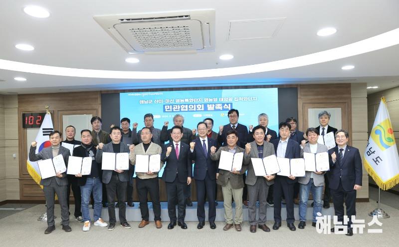 민관협의회는 주민대표와 법인대표 등 민간16명과 전남도,해남군의 정부위원5명,양측에서 절반씩 추천한 공익위원8명으로 구성되었다.공동위원장은 김차진 해남부군수와 이덕주 주민대표가 맡기로 했으며,집적화단지 지정을 위한 제반 절차를 추진하고,주민이익공유 방안 등을 협의해 나갈 예정이다.
