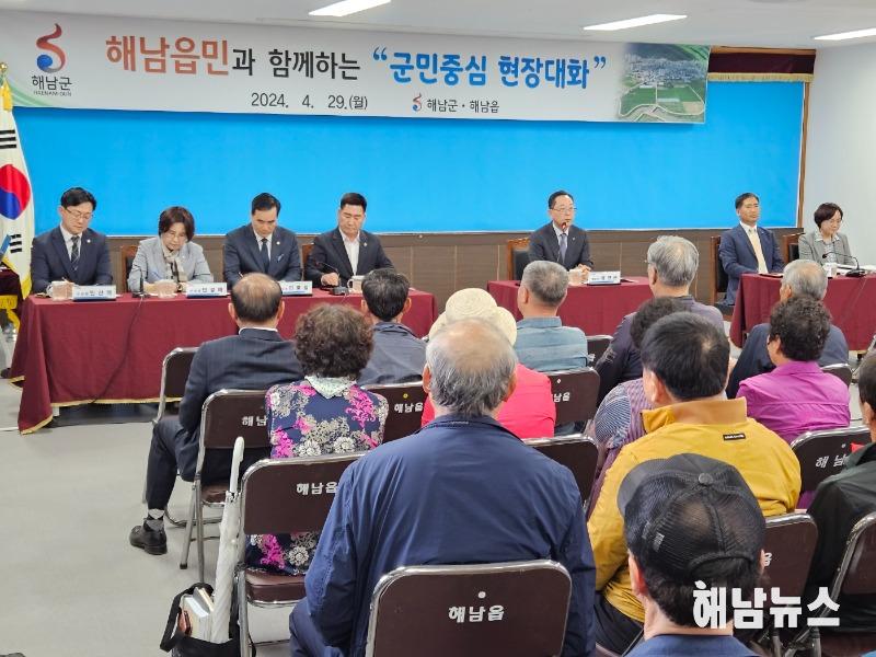 명현관 해남군수가 지난 4월 15일 산이면을 시작으로 14개 읍면을 순회하는 군민중심 현장대화를 갖고 있는 가운데, 29일 오전 북일면에 이어 오후에는 해남읍을 찾아 2023년 군정 주요현안사업에 대한 군민 보고와 더불어 군민들의 의견을 청취하는 시간을 가졌다.