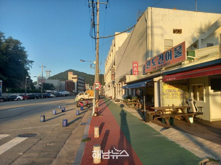 ![]() 완도 수산시장 앞 증비하게 늘어선 주차장의 물통들 / 사진제공=박갑석 기자 |