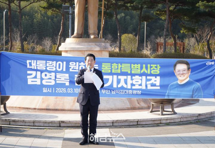 On March 10, Kim held consecutive press conferences at Kim Dae-jung Square in Muan, the briefing room of the Gwangju City Council, and the open plaza of Sunchon National University, declaring his bid for the first mayoral election of the newly integrated metropolitan government.