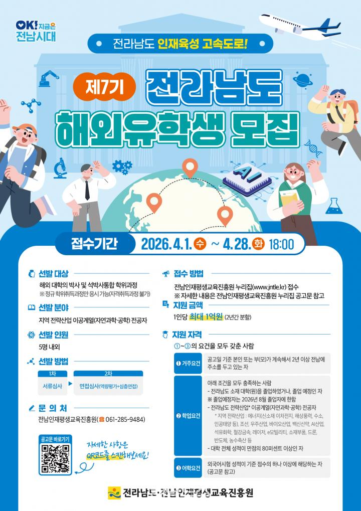 이번 사업은 해외 명문대 박사 및 석·박사 통합과정 진학을 지원해, AI·에너지·첨단산업 등 전남의 미래 전략산업을 이끌 고급 인재를 체계적으로 육성하는 데 목적이 있다.