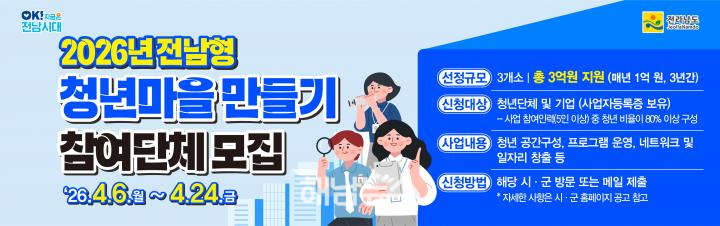 윤연화 전남도 인구청년이민국장은 “청년마을을 통해 청년이 지역에 안정적으로 정착하고, 창업과 일자리로 이어지는 선순환 구조를 만들겠다.”고 밝혔다.