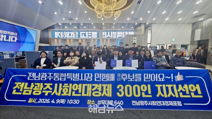 사회적기업, 협동조합, 마을기업 등 사회연대경제 분야 종사자 300명이 더불어민주당 전남·광주 통합특별시장 경선 후보인 민형배 국회의원(광주 광산구을)에 대한 공식 지지를 선언했다.
